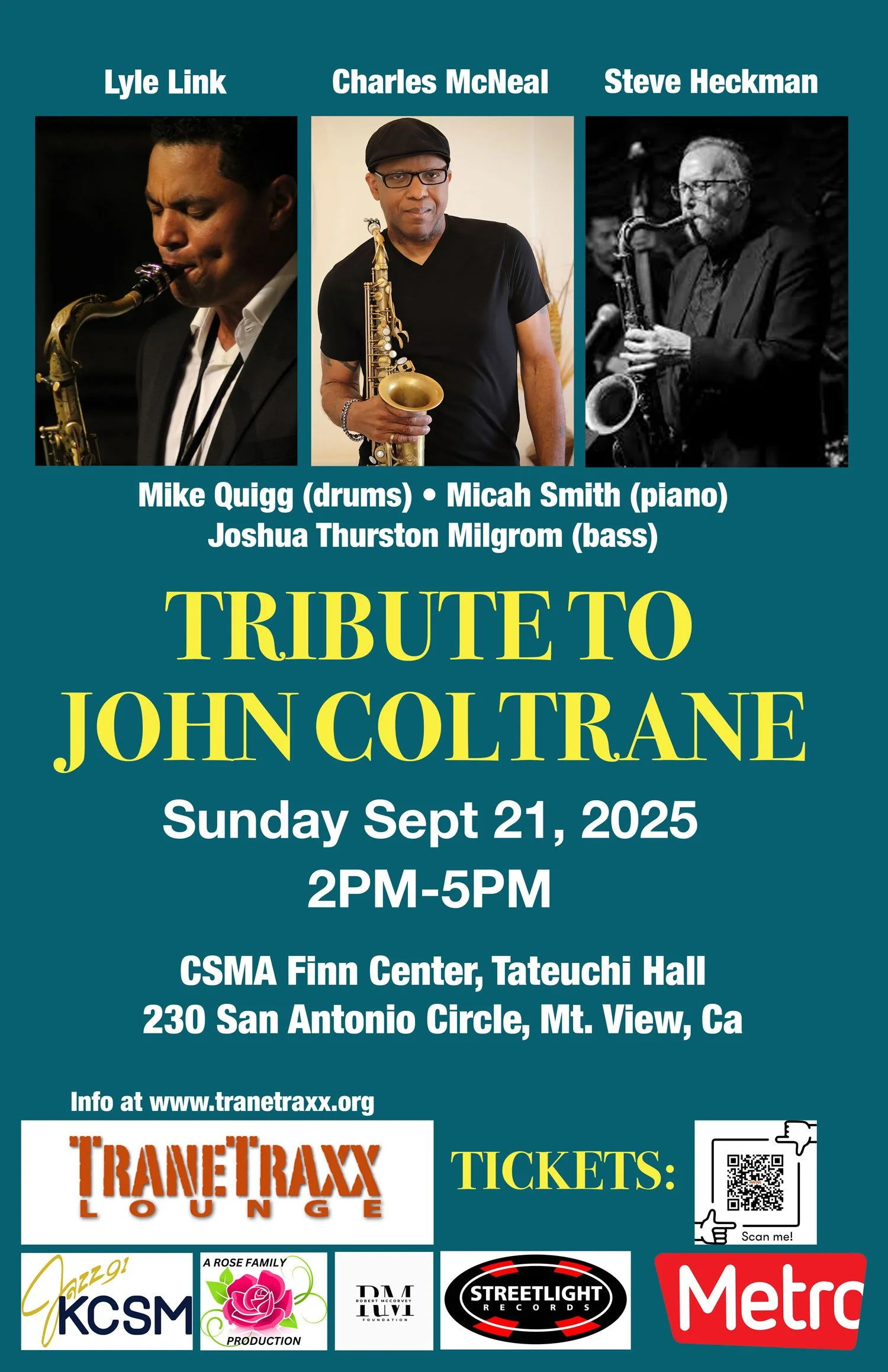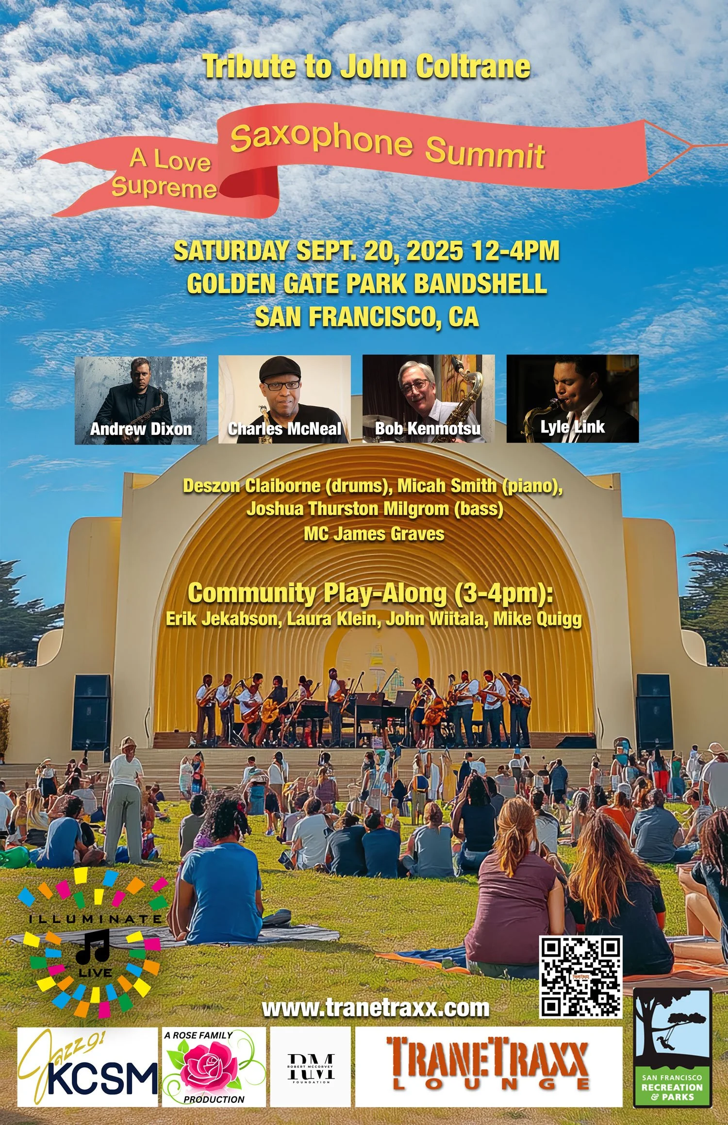 TraneTraxx Lounge and our Partners present Tribute to John Coltrane on September 20, 2025, 12-4pm at the Golden Gate Park Bandshell, San Francisco, CA. This is a FREE Community Benefit Project to bring John Coltrane and A Love Supreme to the masses.
